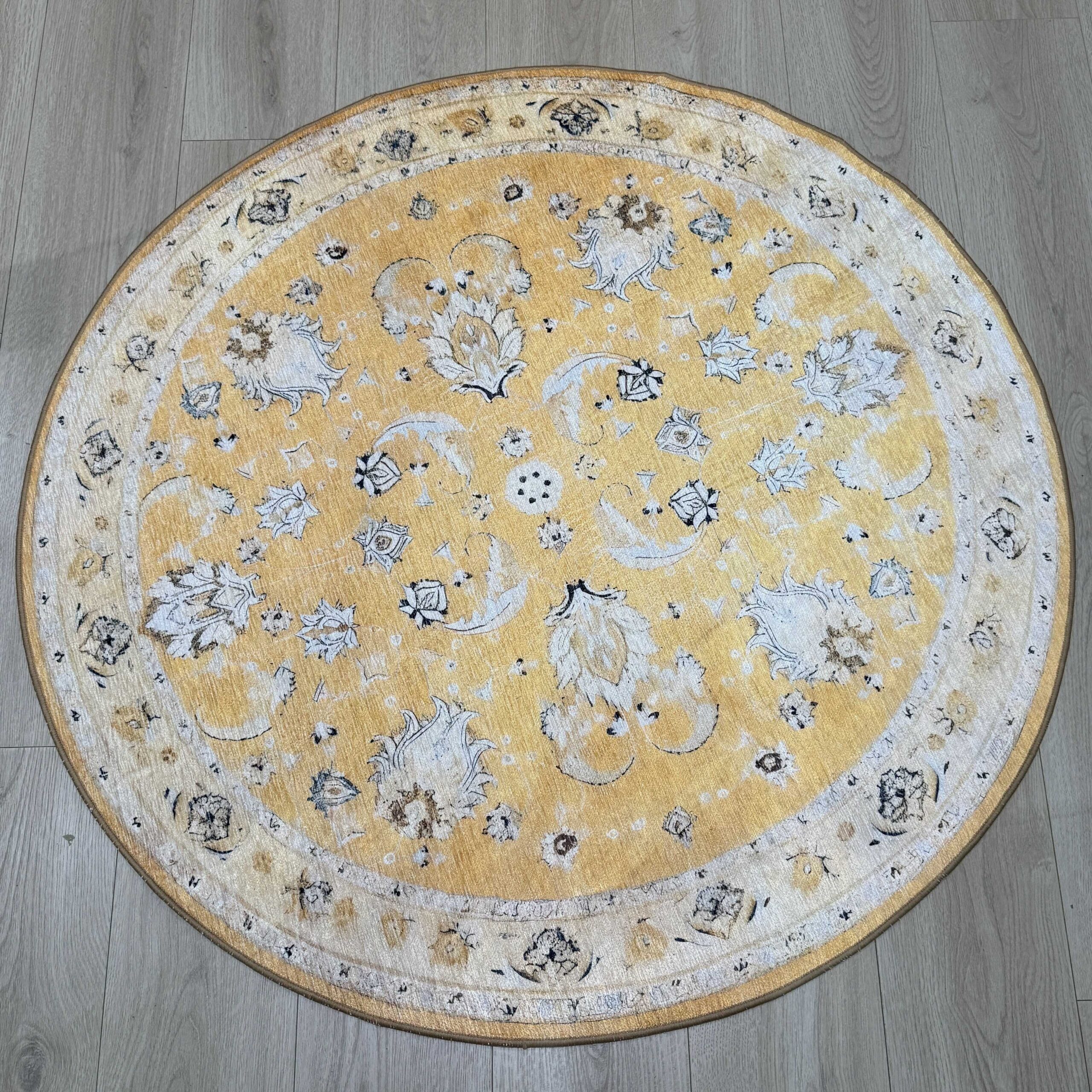 שטיח עגול מודרני בעיצוב מהמם בגווני צהוב, כתום, ירקרק, חרדל, ועוד. מחיר ללא תחרות! מקולקציית אוטנטיק החדשה שלא סופגת נוזלים ולכלוך, עשוי 60% פוליאסטר + 40% כותנה. עיצוב ייחודי, נעים מאוד למגע, הכי קל לניקוי, לא כבד, רמת גימור גבוהה, איכות חומרים מהגבוהות באירופה. מעוצב על ידי גדולי המעצבים בתחום בהתאמה לקו האופנה השנתי. עובי 5 מ"מ , משקל 1600 גר' למ"ר. שכבה תחתונה מיוחדת למניעת החלקה.