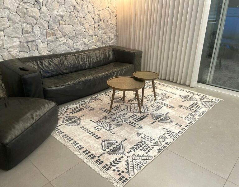 שטיח בוהושיק שמנת לבן עם מעויינים וצורות בצבע שחור עדין בעיצוב מהמם. מחיר ללא תחרות! מקולקציית אוטנטיק החדשה שלא סופגת נוזלים ולכלוך, בצידי השטיח גימור חוטים מרשים! עשוי 60% פוליאסטר + 40% כותנה. עיצוב ייחודי, נעים מאוד למגע, הכי קל לניקוי, לא כבד, רמת גימור גבוהה, איכות חומרים מהגבוהות באירופה. מעוצב על ידי גדולי המעצבים בתחום בהתאמה לקו האופנה השנתי. עובי 5 מ"מ , משקל 1600 גר' למ"ר. שכבה תחתונה מיוחדת למניעת החלקה.
