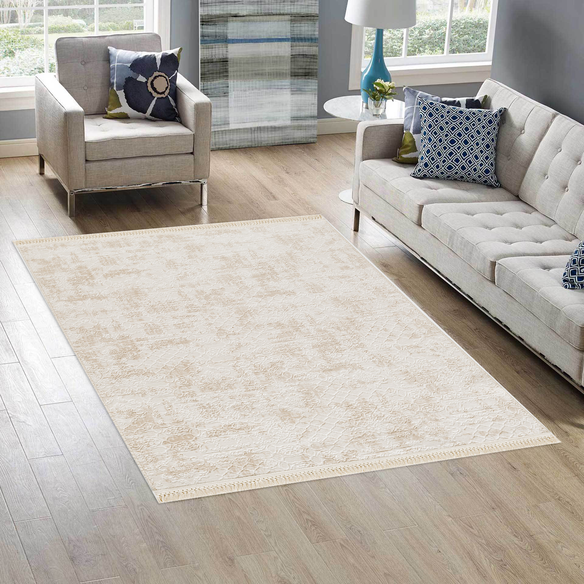 שטיח מודרני בגווני שמנת בעיצוב ים תיכוני מהמם. מחיר ללא תחרות! מקולקציית ספארן החדשה, שטיחים שקטים רכים ונעימים! בצידי השטיח גימור חוטים מרשים. עשוי 100% פוליאסטר. עיצוב ייחודי, קל לניקוי, לא כבד, רמת גימור גבוהה, איכות חומרים מהגבוהות באירופה. מעוצב על ידי גדולי המעצבים בתחום בהתאמה לקו האופנה השנתי. עובי 9 מ"מ , משקל 1500 גר' למ"ר. שכבה תחתונה מיוחדת למניעת החלקה.